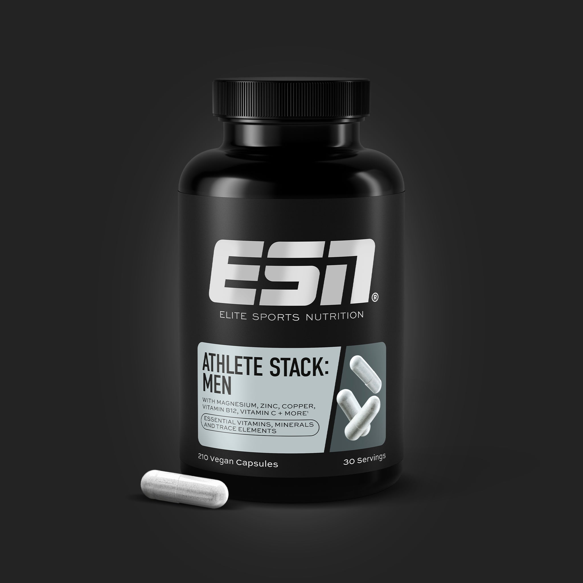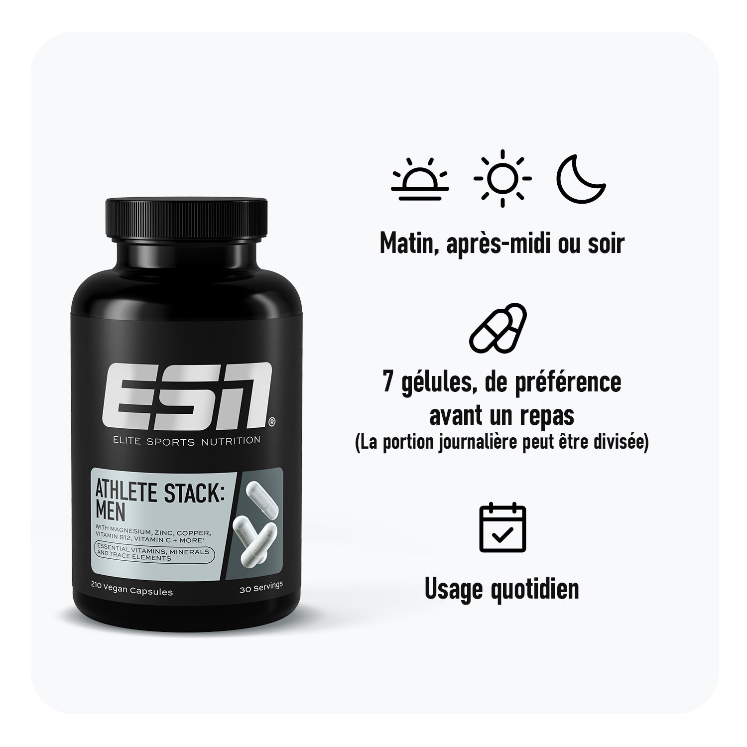 Mélange de vitamines et de minéraux 84 % (citrate de calcium, citrate de magnésium, citrate de potassium, vitamine E (mélange de tocophérols), vitamine C (acide ascorbique), bisglycinate de ferreux, bisglycinate de zinc, anti-agglomérants (els de magnésium d’acides gras, dioxyde de silicium), niacine (nicotinamide), acide folique (acide ptéroylmonoglutamique), acide pantothénique (D-pantothénate de calcium), L-sélénométhionine, vitamine D (D3/cholécalciférol), bisglycinate de manganèse, biotine (D-biotine), vitamine B6 (chlorhydrate de pyridoxine), picolinate de chrome, sélénite de sodium, thiamine (mononitrate de thiamine), riboflavine (vitamine B2), vitamine K (K2/ménaquinone-7), vitamine A (acétate de rétinyle), bisglycinate de cuivre, vitamine A (bêta-carotène), iodure de potassium, vitamine B12 (méthylcobalamine, adénosylcobalamine, hydroxocobalamine acétate)), enveloppe de la gélule (hydroxypropylméthylcellulose).Athlete Stack Men Key-Facts