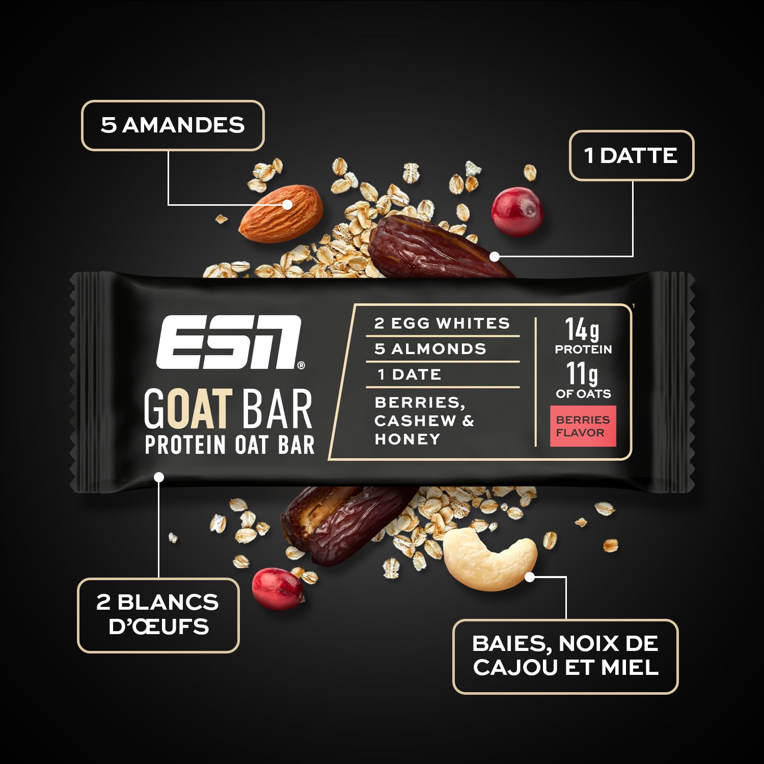 Notre GOAT Bar t’apporte de vrais ingrédients, 14g de protéines de blanc d’œuf de haute qualité, une énergie complète issue de l’avoine, des noix et des fruits – sans additifs, naturellement sucrée avec des dattes & du miel.