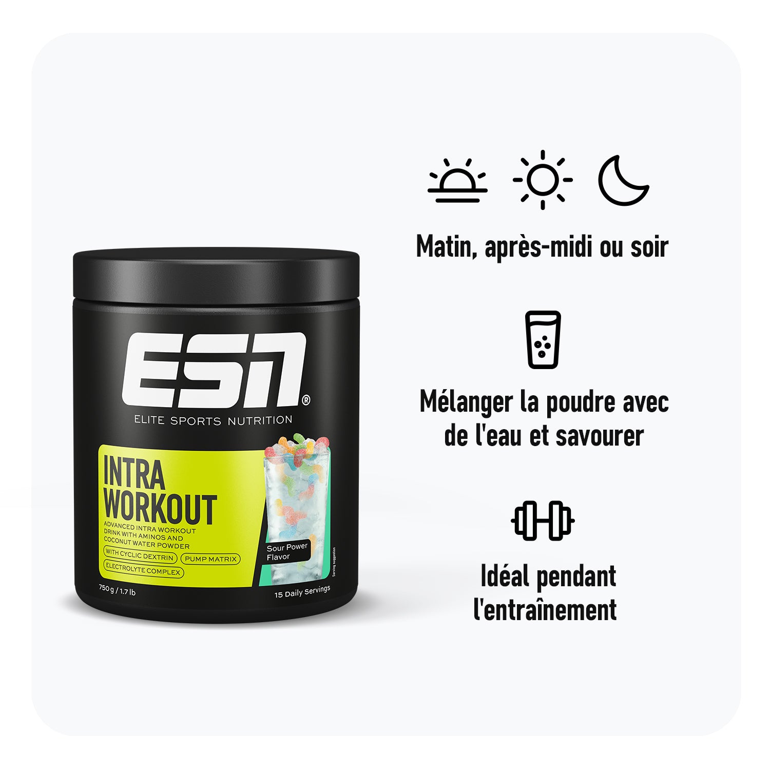 Intra support, intra power - avec notre Intra Workout. Notre boisson tout-en-un te fournit tout ce dont tu as besoin pendant l'entraînement pour une performance maximale : des glucides de haute qualité, des acides aminés précieux et des électrolytes importants. Parfait pour te fournir en même temps de l'énergie rapide et constante, soutenir tes muscles et favoriser ton hydratation - sans mélanger de produits, efficacement et simplement approvisionné par une seule poudre.