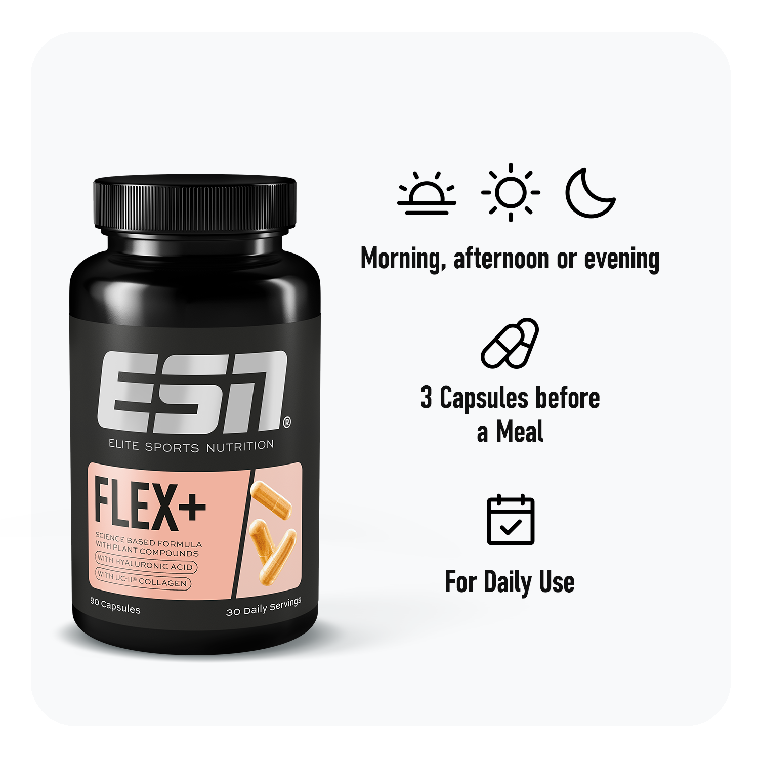 Base solida, movimenti forti. Le nostre capsule Flex+ ti offrono una selezione accuratamente studiata di micronutrienti ed estratti vegetali preziosi: la vitamina C contribuisce alla normale formazione del collagene per una normale funzione di ossa e cartilagini. Zinco e manganese contribuiscono al mantenimento di ossa normali. Il rame contribuisce al mantenimento del tessuto connettivo normale. Il manganese contribuisce alla normale formazione del tessuto connettivo.