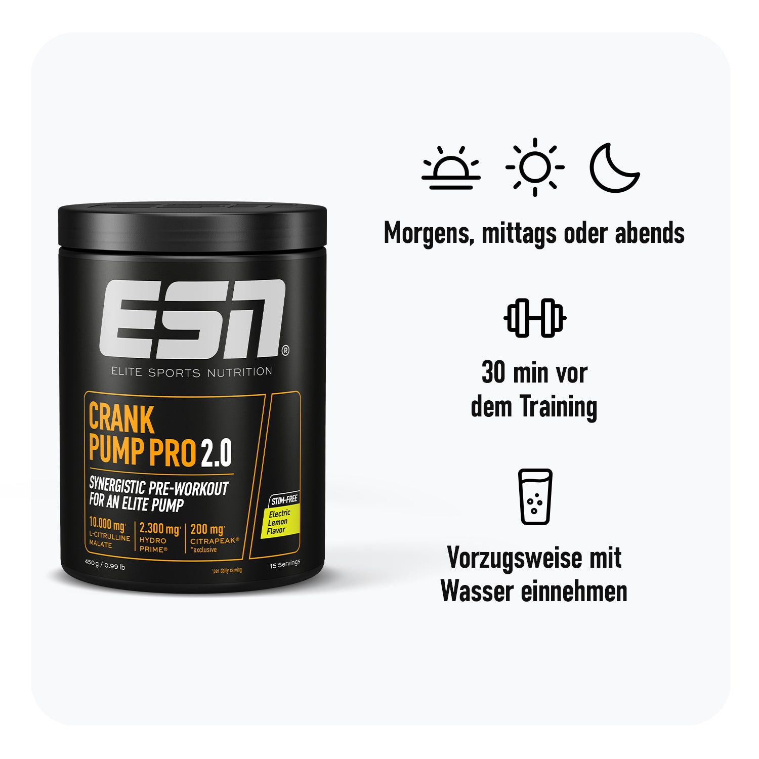 Setting the new standard of pump technology. Mit Crank Pump Pro 1.0 haben wir den Maßstab für Pump-Booster in Europa gesetzt – jetzt sprengen wir ihn: Crank Pump Pro 2.0 bringt als 1. Produkt Europas den innovativen Wirkstoff CitraPeak® in dein Pre-Workout. Zusammen mit weiteren Pump-Highlights liefert er ein Pump-Erlebnis auf Elite-Level – komplett stimulanzfrei. Das ist nicht einfach nur ein Upgrade – es ist eine komplette Neuformulierung für maximale Voluminisierung, die es so noch nicht gegeben hat.