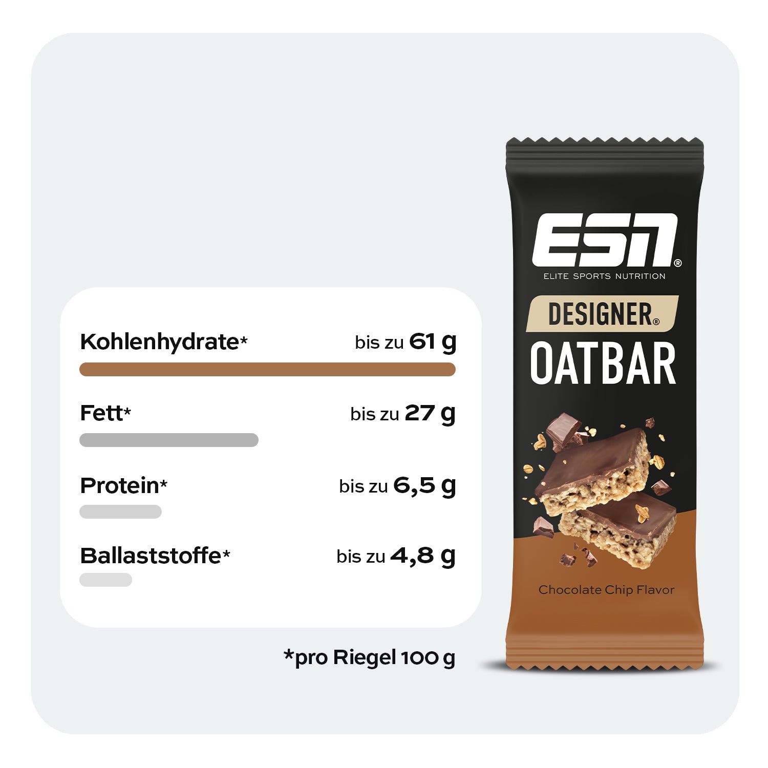 Hafer 33 %, Joghurtüberzug 20 % (Süßungsmittel (Maltit), pflanzliche Fette (Palm, Palmkern, Shea), Süßmolkenpulver, Joghurtpulver 6 %, Emulgator (Lecithine (Sonnenblume)), Säuerungsmittel (Citronensäure)), pflanzliche Öle (Palm, Raps), Zuckerrohrsirup, dunkle Keksstücke 6 % (angereichertes Weizenmehl (Weizenmehl, Calciumcarbonat, Eisen, Thiamin, Niacin), Zucker, pflanzliche Öle (Palm, Raps), fettarmes Kakaopulver, Salz, Backtriebmittel (Natriumcarbonate)), pflanzliche Öle (Shea, Palm), Emulgator (Lecithine (Sonnenblume)), weiße Schokoladenstücke 4 % (Zucker, Kakaobutter, Milchpulver, Molkenpulver, Palmöl, Emulgator (Lecithine (Soja)), Aroma), Sojamehl, Zucker, Feuchthaltemittel (Glycerin), AromaDesigner Oatbar Key-Facts