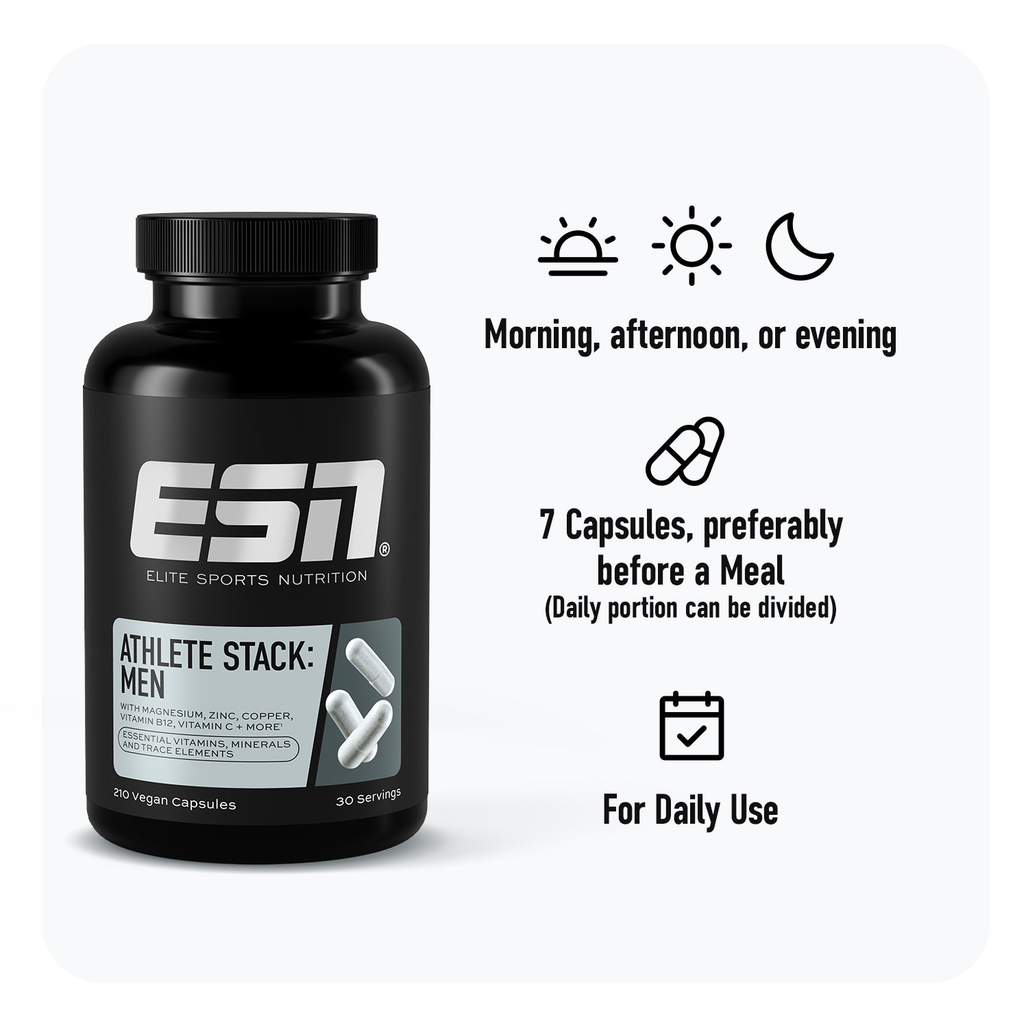Vitamin- und Mineralstoffmischung 84 % (Calciumcitrat, Magnesiumcitrat, Kaliumcitrat, Vitamin E (gemischte Tocopherole), Vitamin C (Ascorbinsäure), Eisenbisglycinat, Zinkbisglycinat, Trennmittel (Magnesiumsalze der Speisefettsäuren, Siliciumdioxid), Niacin (Nicotinamid), Folsäure (Pteroylmonoglutaminsäure), Pantothensäure (Calcium-D-Pantothenat), L-Selenomethionin, Vitamin D (D3/Cholecalciferol), Manganbisglycinat, Biotin (D-Biotin), Vitamin B6 (Pyridoxinhydrochlorid), Chrompicolinat, Natriumselenit, Thiamin (Thiaminmononitrat), Riboflavin (Vitamin B2), Vitamin K (K2/Menachinon-7), Vitamin A (Retinylacetat), Kupferbisglycinat, Vitamin A (Beta-Carotin), Kaliumjodid, Vitamin B12 (Methylcobalamin, Adenosylcobalamin, Hydroxocobalaminacetat)), Kapselhülle (Hydroxypropylmethylcellulose).Athlete Stack Men Key-Facts