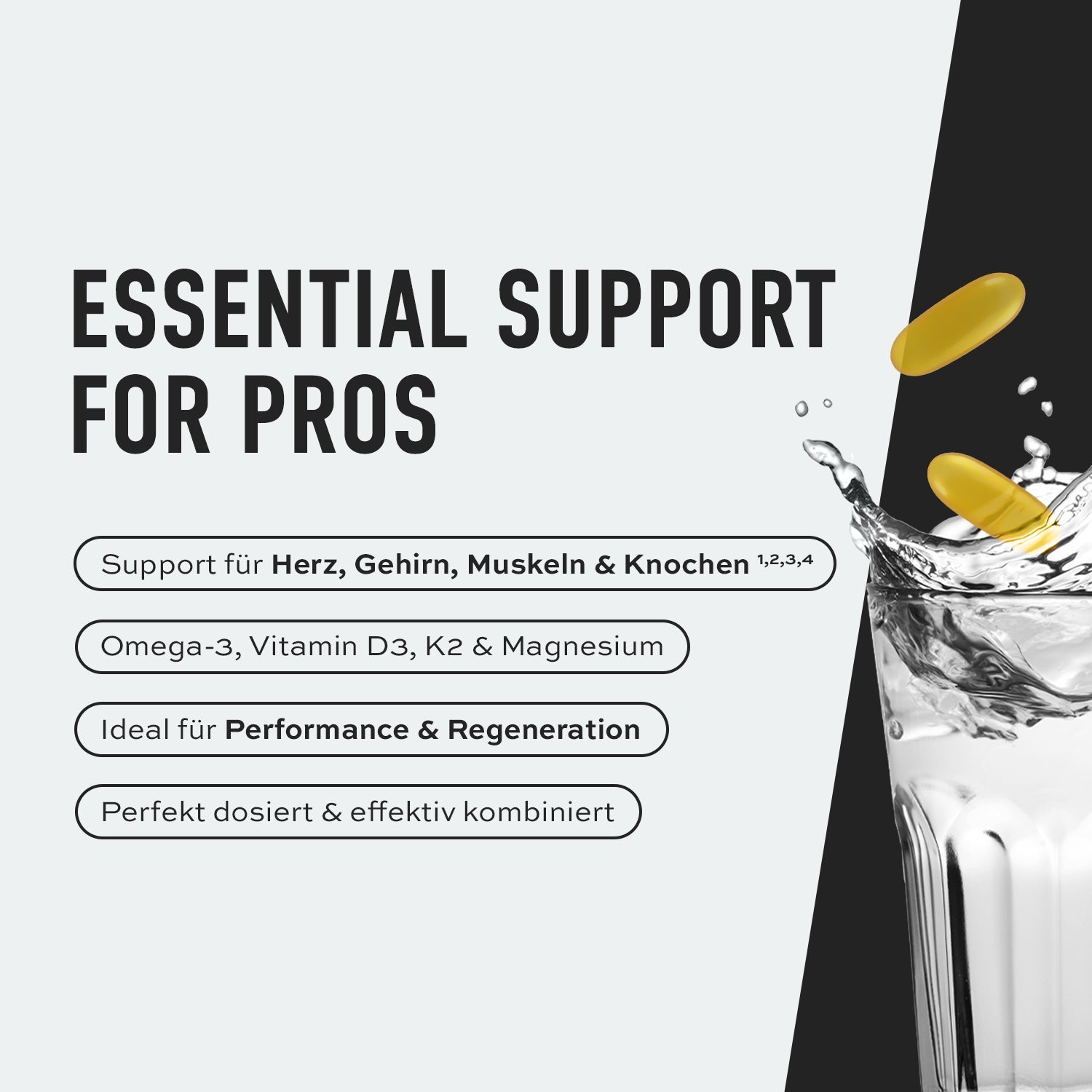 Essential support for pros – mit unseren Essentials. Wir haben die vier essentiellen Nährstoffe Omega-3, Vitamin D3, Vitamin K2 und Magnesium in einem Produkt vereint, damit du gleichzeitig dein Herz, dein Gehirn, deine Muskeln und deine Knochen unterstützt¹'²'³'⁴ Damit schaffst du die gesundheitliche Basis für eine optimale Performance und Regeneration. Get your essential support.