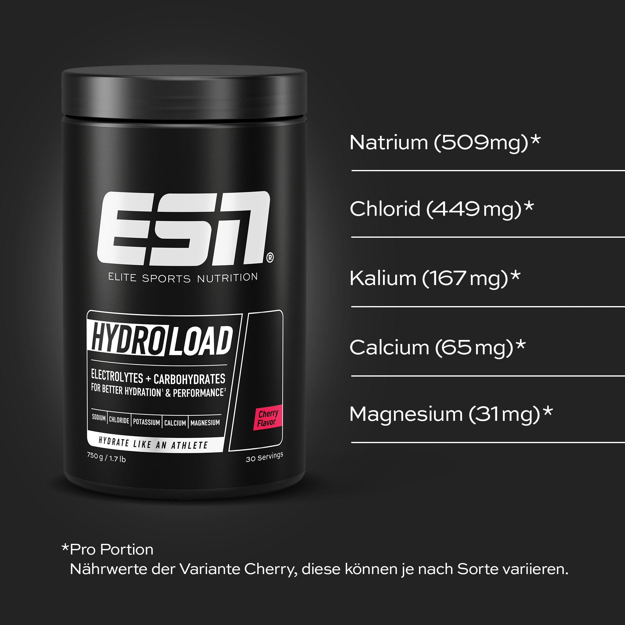 Dextrin, Dextrose, Säuerungsmittel (Citronensäure), Aroma, Natriumbicarbonat, Trennmittel (Siliciumdioxid), Natriumchlorid, Tri-Natriumcitrat-Dihydrat, Calciumgluconat, färbende Lebensmittel (Rote Beete Pulver), Kaliumchlorid, Magnesiumcitrat, Kaliumcitrat,Süßungsmittel (Sucralose, Acesulfam K), Farbstoffe (Carotin).HydroLoad Key-Facts